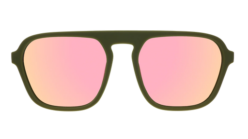 GOODRA dark green, 70's inspired frame with light pink, reflective lenses that minimize glare. These frames are a mid-size fit.