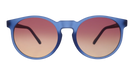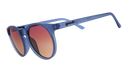 Goodr's classic Circle G style in a translucent dark blue frame featuring a purple-yellow gradient lens that cuts overhead glare while increasing ground visibility. These frames are fit for petite heads.