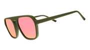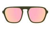 A dark green, 70's inspired frame with light pink, reflective lenses that minimize glare. These frames are a mid-size fit.