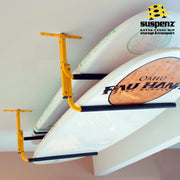 Go “off the wall” with the genius yet simple design of the boat and surfboard ceiling rack. Mounts parallel to ceiling joists, utilizing the strength of ceiling rafters.  Attach padded steel arms with 360° mounting options which adjust vertically to accommodate thicker kayaks and thinner boards simultaneously. The boat and surfboard ceiling rack makes the most of unused space in garage or under a deck while storing watercraft safely out of the way. Holds 2 watercraft, expandable up to 4 SUP's with the use of Ceiling Expansion Rack