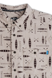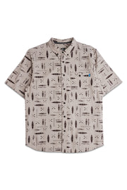 Casual fit, short sleeve button up, button-down collar with recycled polyester logo jacquard tape, single chest pocket with button closure, 25% certified recycled polyester faux wood buttons, back bias cut yoke with center back box pleat, curved hem.