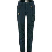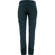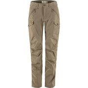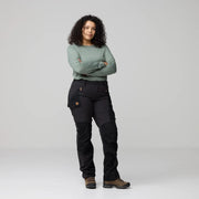 Technical trekking trousers with Curved Fit, designed for women with curvy figures. The fit is more generous over the rear and thighs, while the waist is a little more accentuated than on other trouser models. This gives a more comfortable pair of trousers that sit better on a curvy figure, without being tight, bunching or having a gap at the back of the waist. The trousers combine stretch fabric and G-1000 for excellent freedom of movement and durability – perfect when trekking when you do not want to be restricted by tight trousers. The rear and knees are pre-shaped for the best possible fit, and the waist is cut lower at the front and higher at the back so they sit well when you are carrying a backpack and moving about. Hand pockets with zippers are positioned so they are easily accessed even when wearing a backpack with a hipbelt. One large leg pocket with flap and a smaller inner pocket in mesh on the right leg, plus a smaller leg pocket for a mobile phone or GPS on the left leg. Stretch fabric below the waist and G-1000 reinforcements over the rear, knees and leg endings. Raw-length leg endings that can easily be adjusted to your own height.