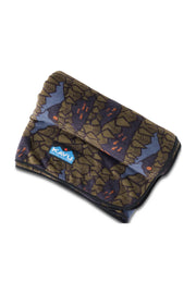 Printed polar fleece blanket, black elastic binding on all four sides, KAVU logo label.